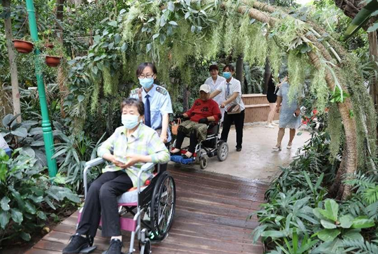 隨后,志愿者和護工們推著輪椅上的截癱休養員、挽著智障兒童,乘坐兩輛新能源低踏板公交車來到南湖景區植物風情館參觀游覽。一行人漫步在高大茂盛的熱帶植物叢林中,志愿者按照標識耐心地為截癱休養員和智障兒童講解植物信息,愉快的交談引得歡聲笑語久久回蕩。“現在城市發展越來越快,公交車也越來越舒適了,雖然離南湖很近,但是我們出來不方便,這次能出來看看,真是特別感謝。”一位截癱休養員高興地說。