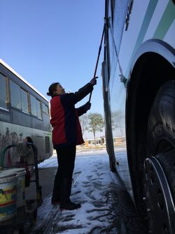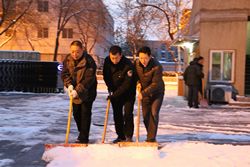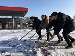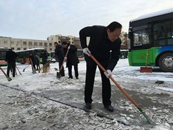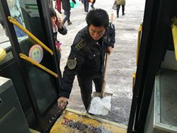 5點,分公司、路隊兩級管理人員全部按照分工,到達指定線路、樞紐站,開始協助司機加水、熱車,做好發車前的準備。6點半,總公司、分公司機關管理人員開始清掃站點積雪;客流集中的各大站點,管理人員已經在疏導乘客,指揮車輛進出站。初冬的凌晨溫度最低,冷風直透心底。上午9點多,當直播五十分和唐山交通臺的記者趕到遠洋城站點采訪時,一公司的管理人員已在此堅守了四個多小時。大雪讓車身結了厚厚的一層冰和泥,保潔員們用工具一點一點艱難地清理著。