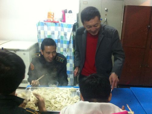 總經(jīng)理趙俊良來到二公司時,正好遇上黃海廠家的兩名售后服務人員因工作需要留在了唐山過年,趙總真誠地邀請他們一道吃餃子、過大年。他們由衷地稱贊唐山公交:我們的企業(yè),從沒遇到過這樣的事,感覺你們的企業(yè)就像一個大家庭。我們在這里過年,也感受到了這濃濃的家一般的親情!黨委書記、副總經(jīng)理夏保良到三公司銀河路車場慰問時,不僅詳細了解了路隊節(jié)期的工作安排情況,還親自為職工煮餃子,遞到跑車回來的司機手中,微笑地囑咐他們趁熱吃、多吃點。狹小的廚房,水氣氤氳,處處洋溢著新春的喜悅和干群同心的和諧。
