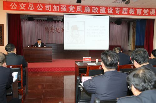 為切實履行黨委黨風廉政建設主體責任,提高各級黨員干部的拒腐防變意識,總公司黨委于3月25日在丁家屯車場會議室進行了題為“加強黨風廉政建設,推進唐山公交健康有序和諧發展”的廉政教育專題黨課,由黨委書記、副總經理夏保良主講。總公司全體班子成員、中層干部以及所屬各單位科隊長以上干部,計三百余人接受了廉政教育。黨課由黨委副書記、紀委書記客林榮主持。